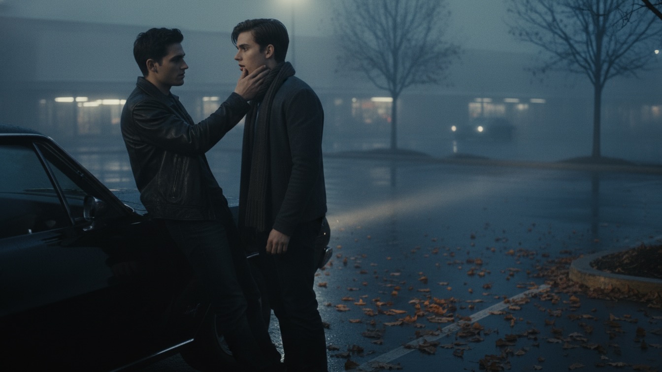 Trapped in a desolate mall parking lot on a grim autumn evening, Carter finds himself unsettlingly bound to Steve, whose quiet intensity promises a dark, inescapable intimacy amidst the ironic festive glow.