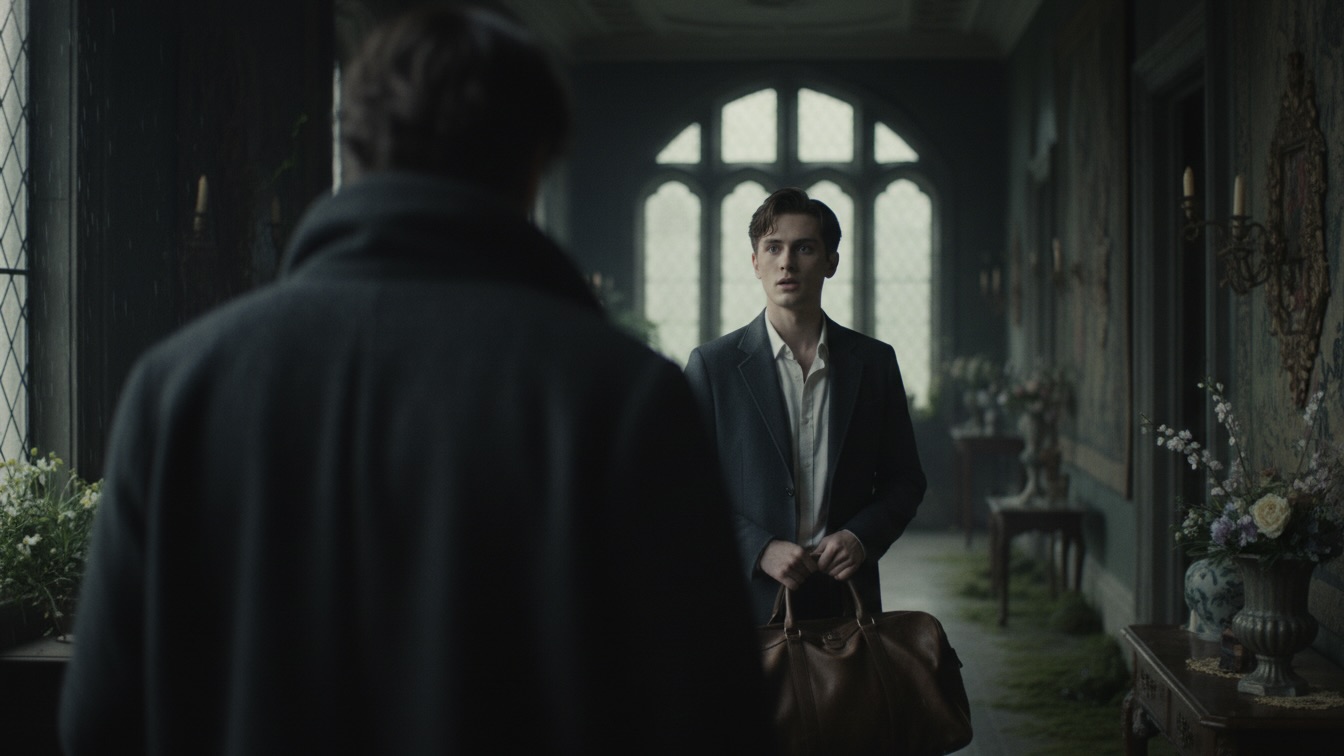 I pushed open the door, the groan of the hinges loud in the still air. My boots squelched in the muddy gravel of the drive. The man had stopped perhaps ten feet from me, close enough for me to feel the chill emanating from him, or perhaps it was just my own anxiety. He was older than me, perhaps by a few years, but carried himself with an ancient gravity that belied his apparent youth. There was an elegance to his stillness, a poise that made my own fidgeting feel clumsy and raw.