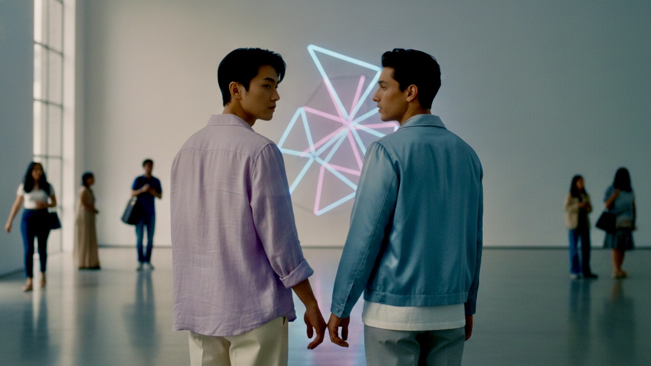 Noah turned his head, his eyes meeting Evan’s. “Yeah,” he agreed, his voice equally hushed. “Like a breath held, or a secret caught in time.” His gaze shifted back to the art, then to Evan, a shared understanding passing between them, wordless but profound. The air between them felt charged, a quiet hum that vibrated just beneath Evan’s skin. His body was hyper-aware of Noah’s proximity, the way his warmth seeped into the cool gallery air, the faint rustle of his jacket as he shifted his weight.