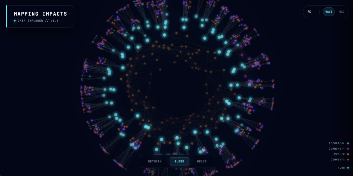 Visualizing impact assessment data: each node represents a dataset, showing connections and patterns through layout and color.